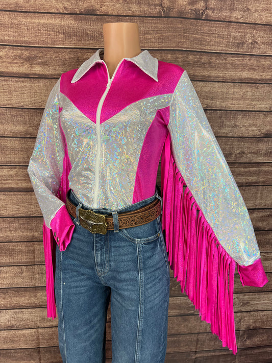 Pink and White Rodeo Shirt with Thunderbird Fringe