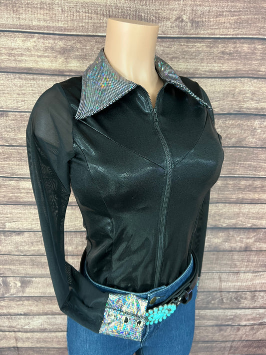 Black Mystique Mesh Sleeve Zipper Front Rodeo Shirt