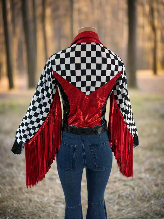 Checks in the Red Snap Front Rodeo Shirt with Thunderbird Fringe