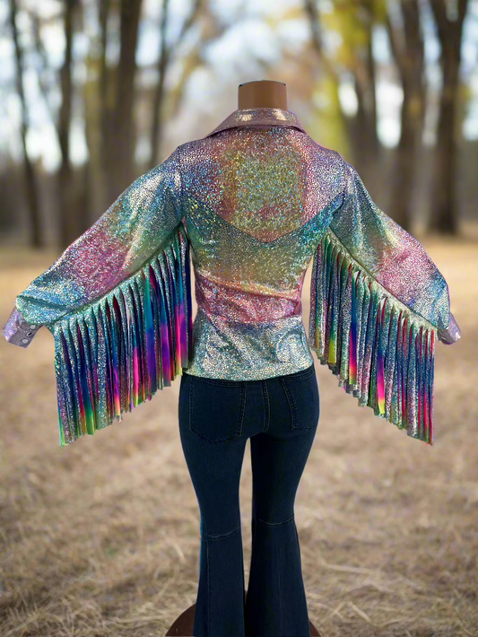Rainbow Shattered Glass Rodeo Shirt with Thunderbird Fringe