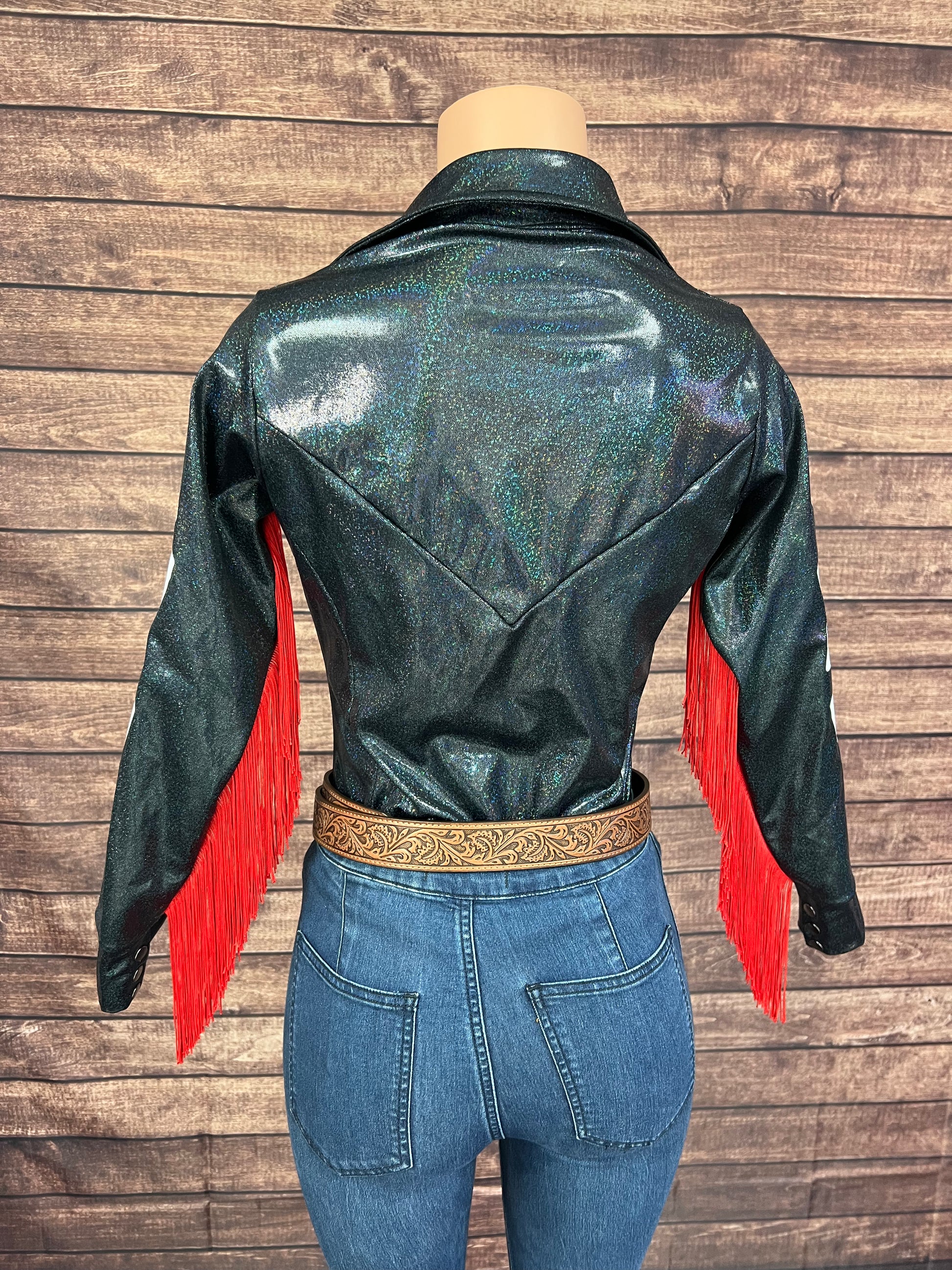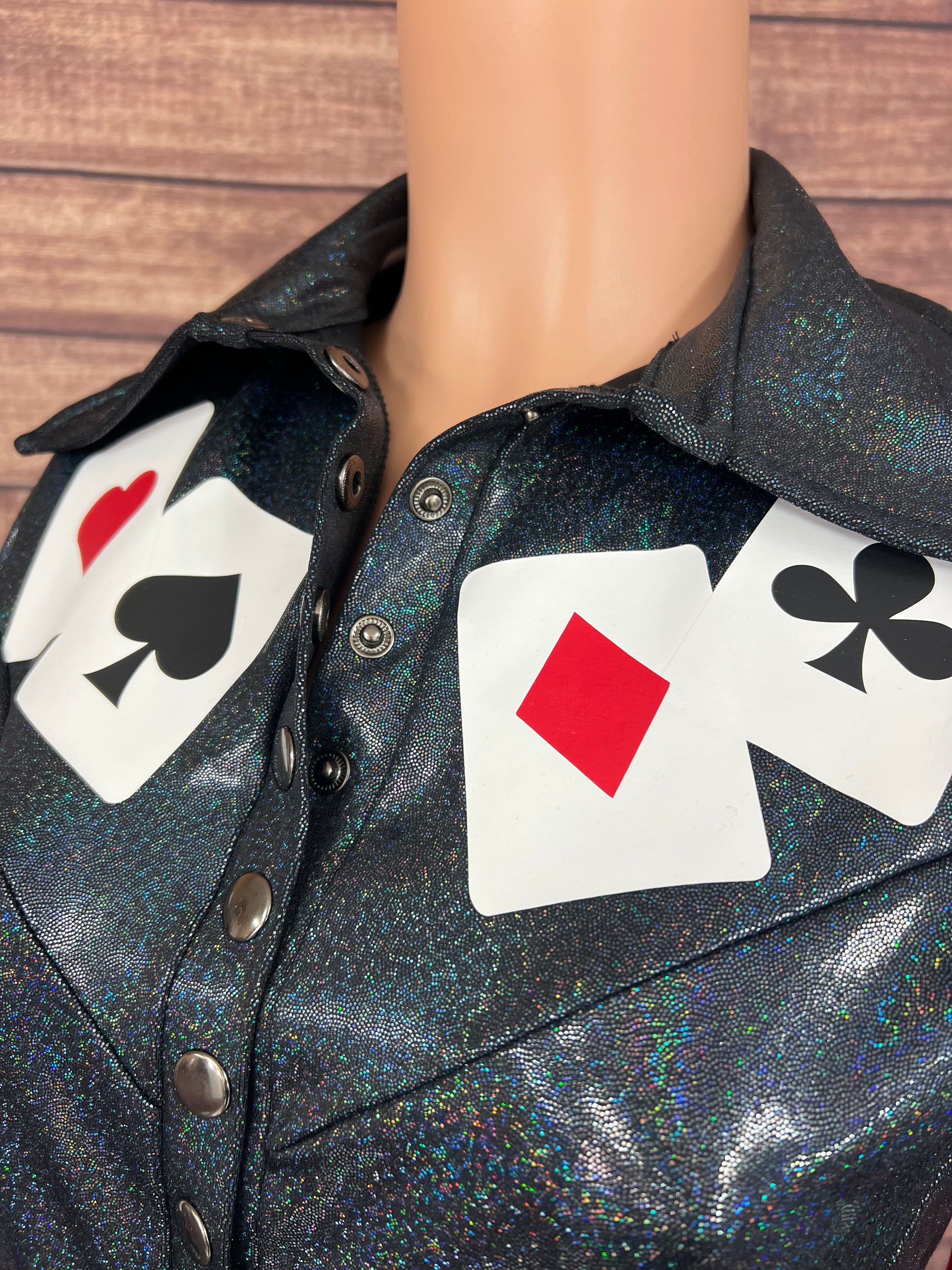 Our poker inspired shirt, now available in a SNAP FRONT! What a lucky draw! This shirt features vinyl playing cards on the sleeves and yoke. Back yoke is plain. Red 6" chainette fringe on the sleeves.