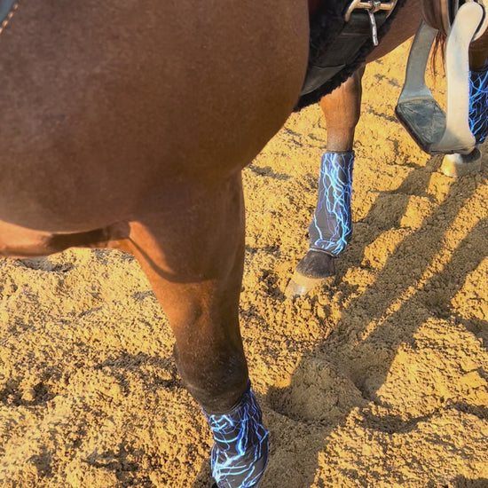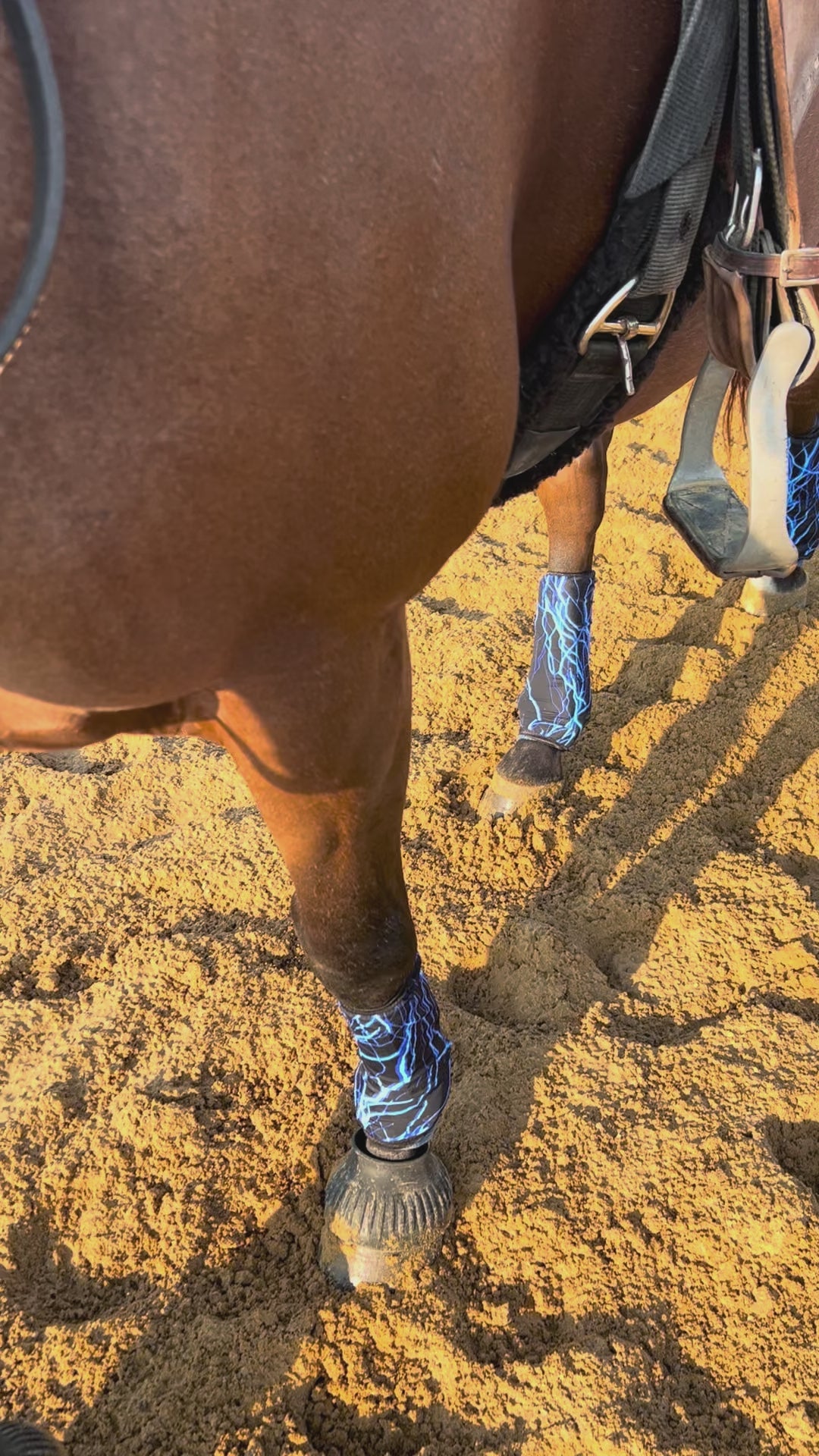 These covers are stretchy, easy to put on, with a velcro closure down the side. The velcro and the stretch of the fabric give you adjustability to make sure they are not too tight or too loose, and to allow them to fit over many styles of splint boots, brushing boots, SMB's, and other styles of leg protection.